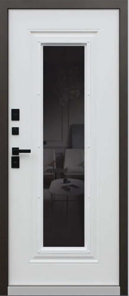 Панель МДФ 16 мм (цвет "белый матовый"). Стеклопакет тонированный. Прижимная рамка. Объемная фрезеровка вокруг стеклопакета.